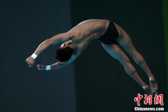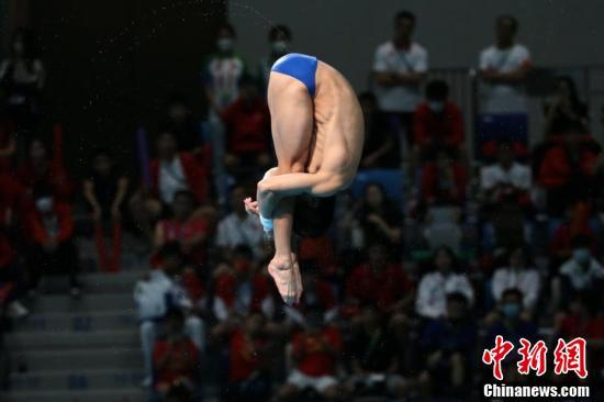 9月14日,山东队练俊杰在比赛中。当日,第十四届全国运动会跳水男子10米跳台决赛在西安奥体中心跳水馆进行,奥运亚军、四川选手杨健以574.20分的成绩夺冠。山东队练俊杰获得亚军,广东队陈艾森摘得铜牌。 中新社记者 张远 摄