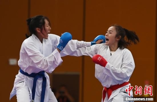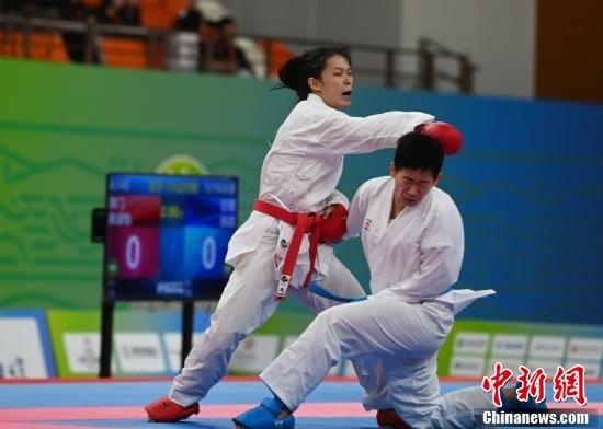9月17日,第十四届全国运动会空手道项目女子-55公斤级比赛在西安举行。图为澳门队运动员黄淑怡(左)与甘肃队运动员徐晨在1/16比赛中。中新社记者 安源 摄