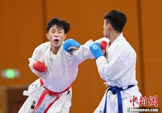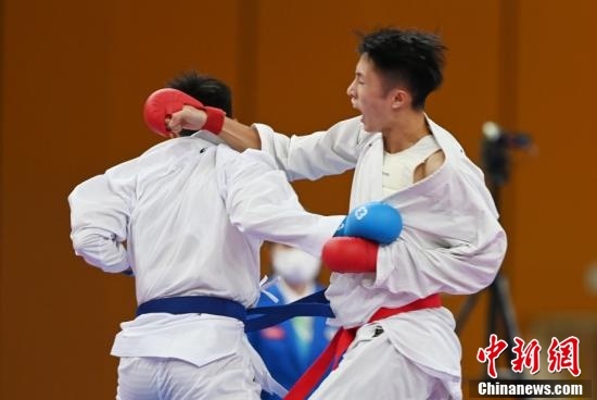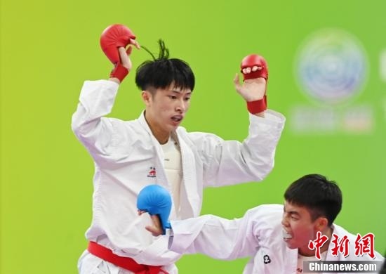 9月17日,第十四届全运会空手道项目男子-67公斤级比赛在西安举行。图为澳门队运动员黄文迪(左)与湖北队运动员耿永乐在1/16比赛中。中新社记者 安源 摄