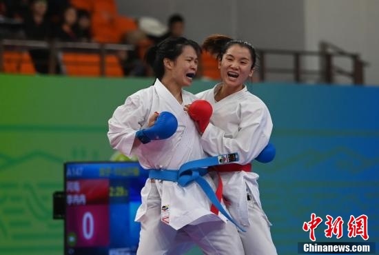 9月17日,第十四届全国运动会空手道项目女子-55公斤级比赛在西安举行。图为澳门队运动员黄淑怡(左)与河南队运动员李冉冉在1/8比赛中。 中新社记者 安源 摄