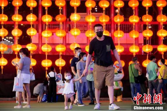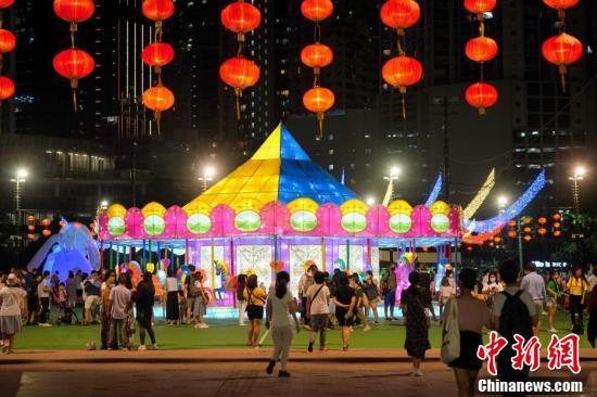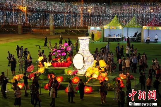 9月18日晚,香港维多利亚公园的灯饰吸引市民参观。随着香港新冠疫情持续稳定,特区政府康乐及文化事务署(康文署)在维园等地恢复举办中秋灯会,在遵守防疫措施的前提下,让市民欢度中秋佳节。去年中秋节,受疫情影响,康文署取消了维园等地的中秋灯会。 中新社记者 张炜 摄