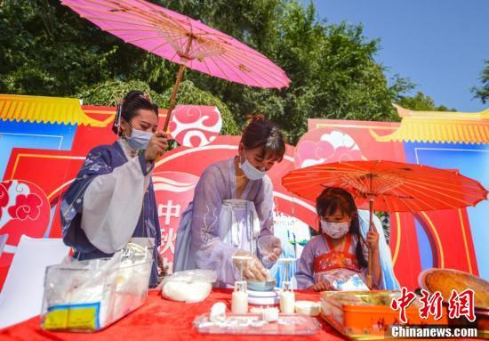 9月19日,新疆乌鲁木齐,工作人员身着国潮服饰,与小朋友一起制作月饼。当日,在乌鲁木齐市水磨沟公园,一场“缘聚水磨·国潮中秋”游园会吸引不少汉服爱好者参与,市民与游客共同迎接中秋节的到来。 中新社记者 刘新 摄