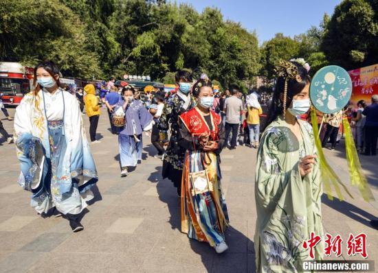 9月19日,新疆乌鲁木齐,汉服爱好者参与游园会。当日,在乌鲁木齐市水磨沟公园,一场“缘聚水磨·国潮中秋”游园会吸引不少汉服爱好者参与,市民与游客共同迎接中秋节的到来。 中新社记者 刘新 摄