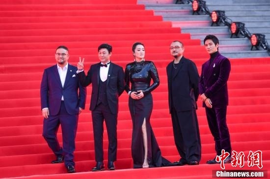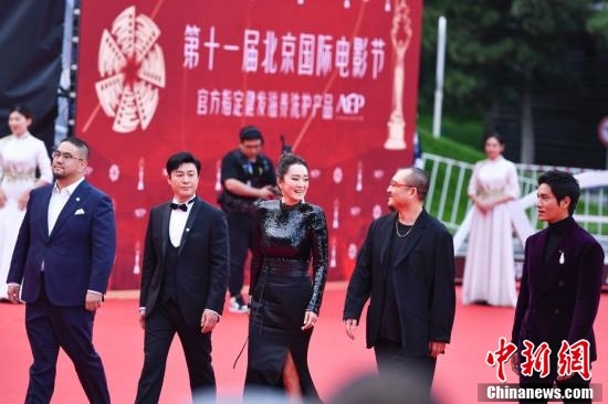 9月20日晚,北京,第十一届北京国际电影节“天坛奖”评委主席巩俐(中),评委陈坤(右一) 、乌尔善(右二)、张颂文(左二)、陈正道(左一)亮相开幕红毯。当晚,第十一届北京国际电影节在北京开幕。 中新社记者 田雨昊 摄