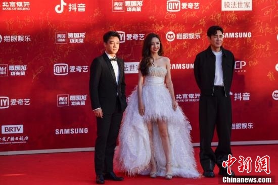 9月20日晚,北京,第十一届北京国际电影节开幕仪式主持人郑凯(左)、佟丽娅(中)、于和伟(右)亮相开幕红毯。当晚,第十一届北京国际电影节在北京开幕。 中新社记者 田雨昊 摄