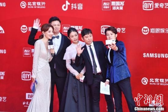 9月20日晚,北京,第十一届北京国际电影节开幕红毯主持人在与演员们自拍合影。当晚,第十一届北京国际电影节在北京开幕。 中新社记者 田雨昊 摄