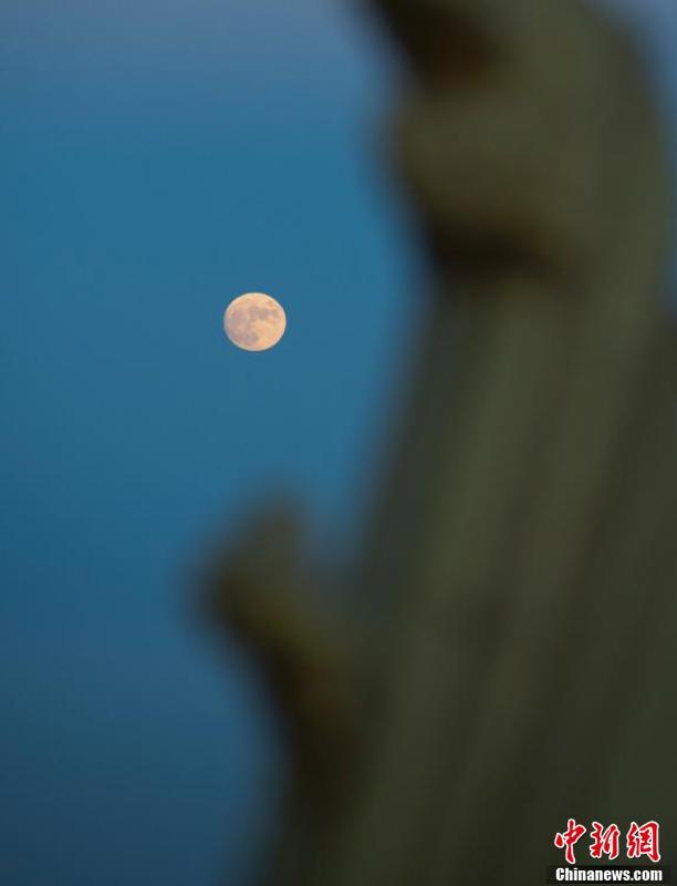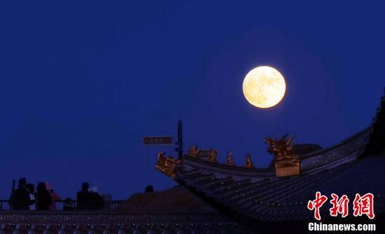 9月20日,四川峨眉山天气晴好,一轮明月在晚间慢慢升起,“悬挂”在峨眉山金顶之上,吸引游客观赏。 中新社记者 刘忠俊 摄