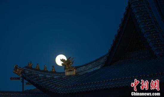 9月20日,四川峨眉山天气晴好,一轮明月在晚间慢慢升起,“悬挂”在峨眉山金顶之上。 中新社记者 刘忠俊 摄
