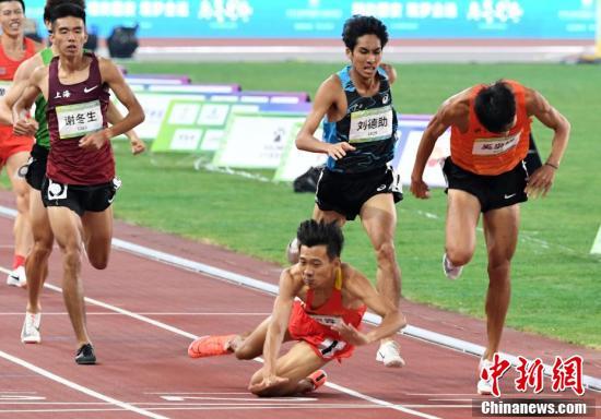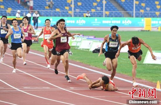 9月22日,第十四届全运会田径男子800米决赛在陕西西安举行,获得前三名的分别是山西李俊霖、新疆阿力木江·热河麦提、浙江奚枭横(并列第二)、广西刘德助。图为李俊霖冲过终点后摔倒。 中新社记者 杨艳敏 摄