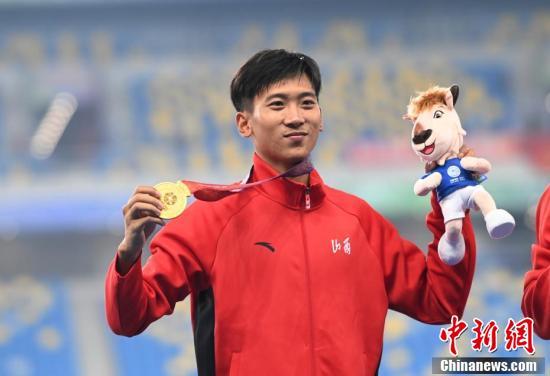 9月22日晚,第十四届全运会田径男子800米决赛在西安举行,山西选手李俊霖以1分48秒33的成绩夺得冠军。图为李俊霖向观众展示奖牌。 中新社记者 安源 摄