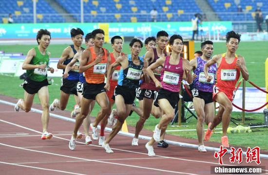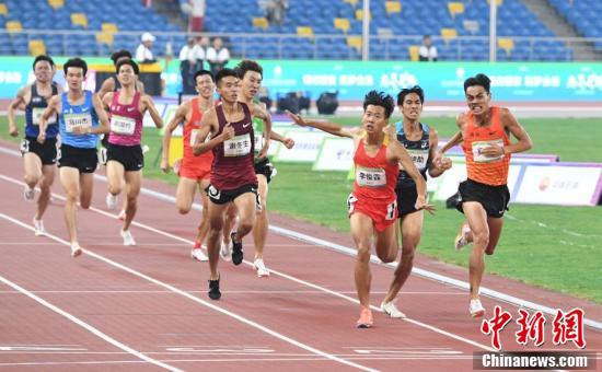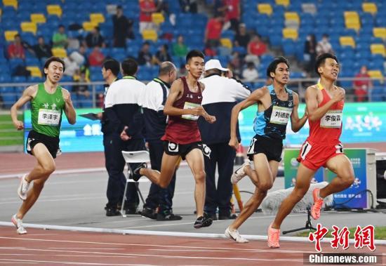 9月22日晚,第十四届全运会田径男子800米决赛在西安举行,山西选手李俊霖以1分48秒33的成绩夺得冠军。图为李俊霖(领先者)在比赛中。 中新社记者 安源 摄