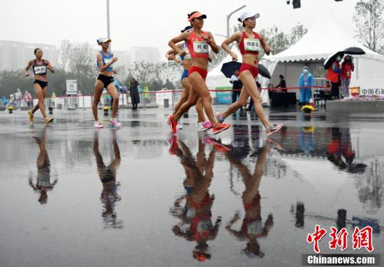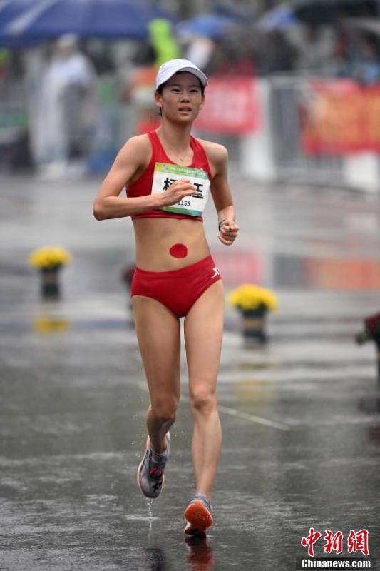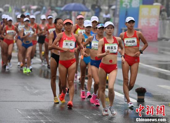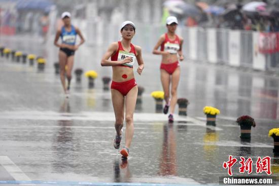 9月24日,陕西西安,第十四届全运会田径女子20公里竞走决赛在雨中进行。内蒙古队选手杨家玉获得冠军,青海队选手切阳什姐、陕西队选手杨柳静分获亚军、季军。 中新社记者 毛建军 摄