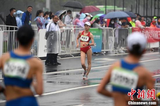 9月24日,陕西西安,第十四届全运会田径女子20公里竞走决赛在雨中进行。内蒙古队选手杨家玉获得冠军,成为全运会两连冠。图为杨家玉。 中新社记者 毛建军 摄