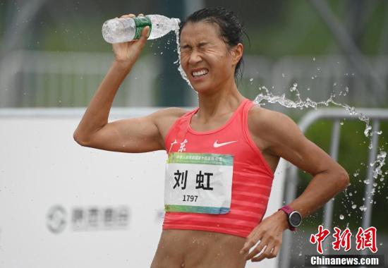 9月24日,陕西西安,第十四届全运会田径女子20公里竞走决赛在雨中进行。内蒙古队选手杨家玉获得冠军,成为全运会两连冠。图为杨家玉在比赛途中补水。 中新社记者 毛建军 摄