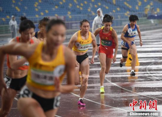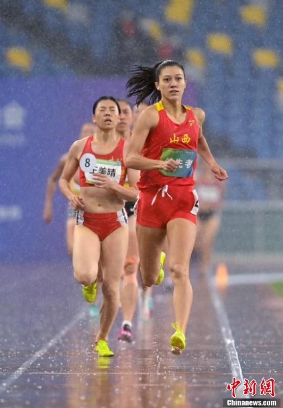 9月25日晚,第十四届全运会田径女子七项全能在西安奥体中心结束全部项目,山西队选手郑妮娜力以6026分的总分获得冠军。图为郑妮娜力(右二)在800米比赛中起跑。 中新社记者 侯宇 摄