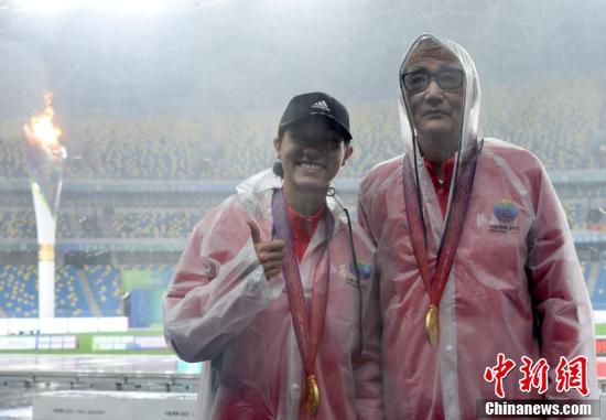 9月25日晚,第十四届全运会田径女子七项全能在西安奥体中心结束全部项目,山西队选手郑妮娜力以6026分的总分获得冠军。图为郑妮娜力(左)和自己的外公、教练段其炎在颁奖仪式后合影。 中新社记者 侯宇 摄