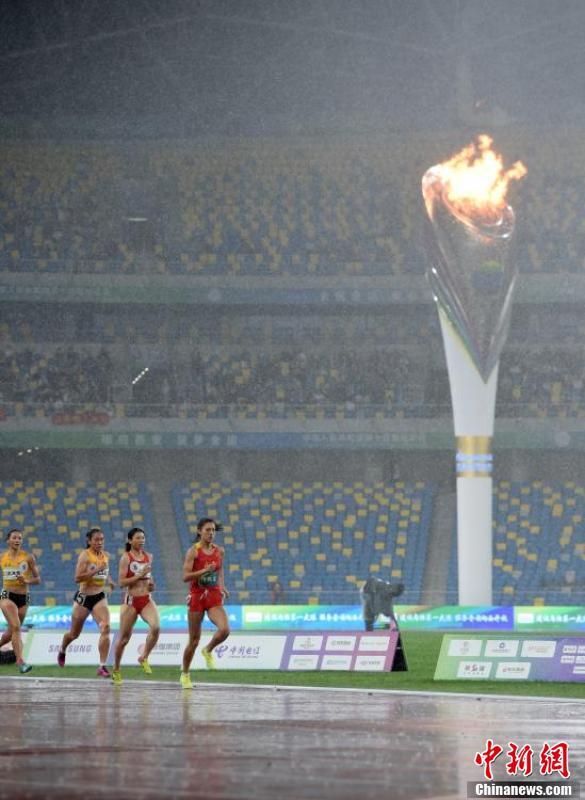 9月25日晚,第十四届全运会田径女子七项全能在西安奥体中心结束全部项目,山西队选手郑妮娜力以6026分的总分获得冠军。图为郑妮娜力(前)在800米比赛中。 中新社记者 侯宇 摄