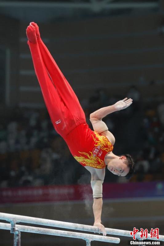 9月26日,在陕西西安举行的第十四届全运会男子双杠决赛中,四川队选手邹敬园夺冠。图为邹敬园在比赛中。 中新社记者 蒋启明 摄