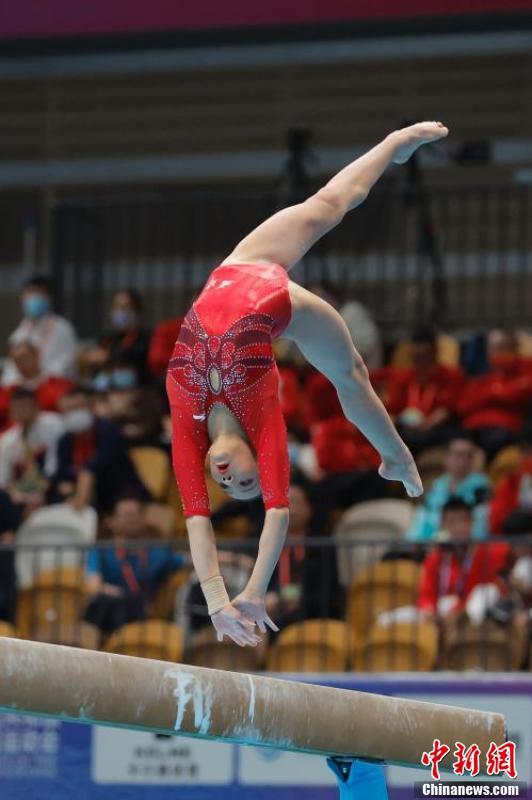 9月26日,在陕西西安举行的第十四届全运会女子平衡木决赛中,东京奥运会冠军管晨辰再次上演“袋鼠摇”。最终,管晨辰在所有选手中名列第五,无缘奖牌。图为管晨辰在比赛中。 中新社记者 蒋启明 摄