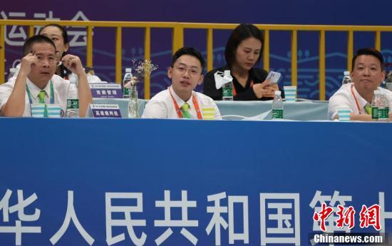 9月26日,陕西西安,“奥运五冠王”邹凯(前排中)作为第十四届全运会体操男子项目的高级裁判组成员,现身体操比赛现场。 中新社记者 蒋启明 摄