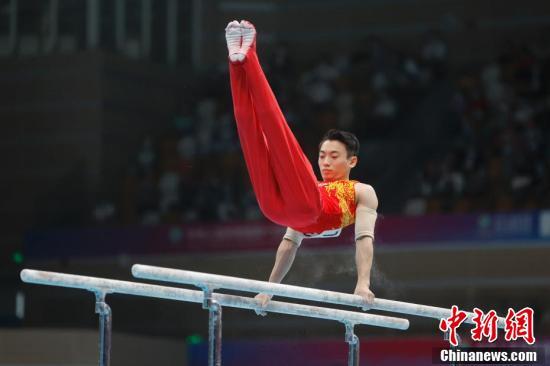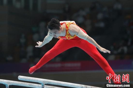 9月26日,在陕西西安举行的第十四届全运会男子双杠决赛中,四川队选手邹敬园夺冠。图为邹敬园在比赛中。 中新社记者 蒋启明 摄