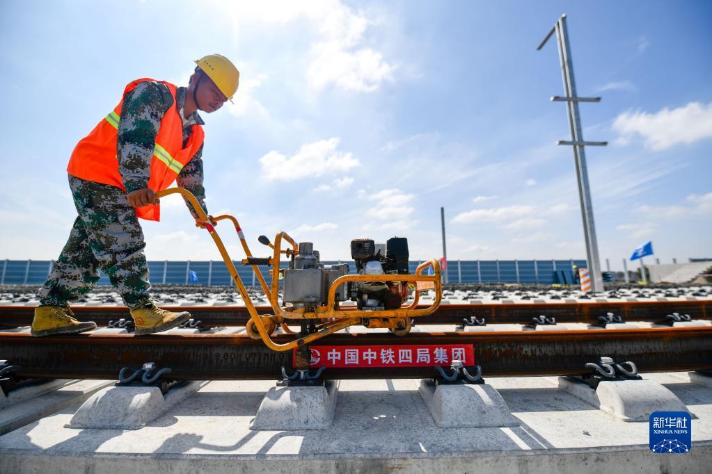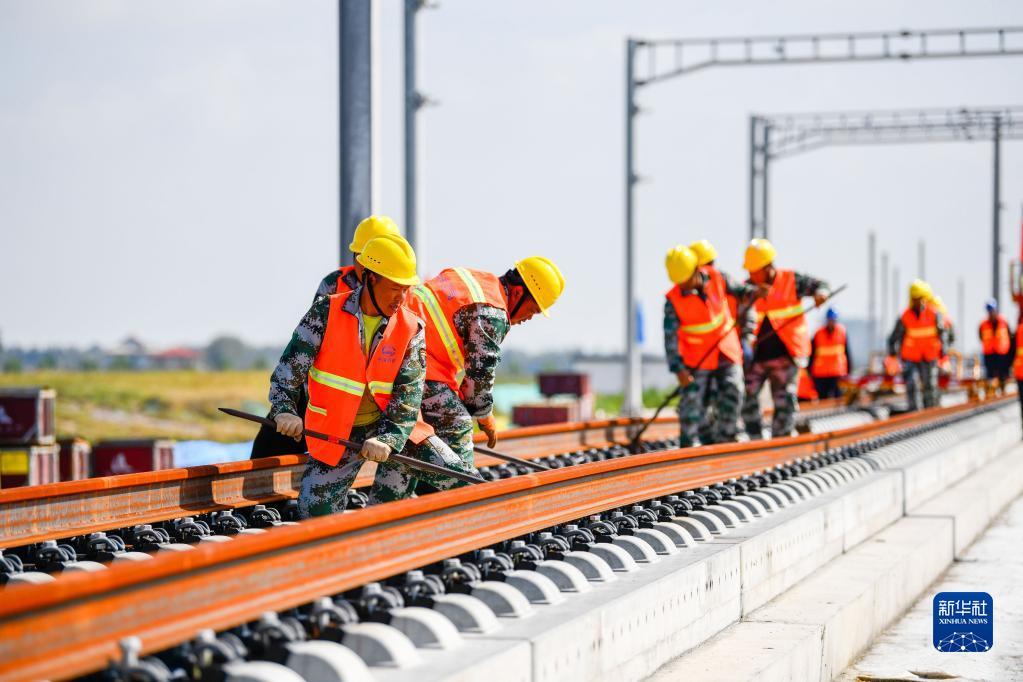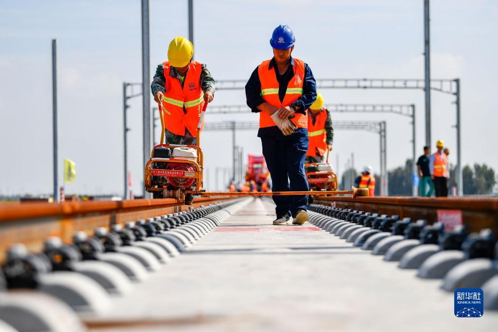 9月27日,中铁四局工人在京唐城际铁路铺轨现场作业。新华社记者 牟宇 摄