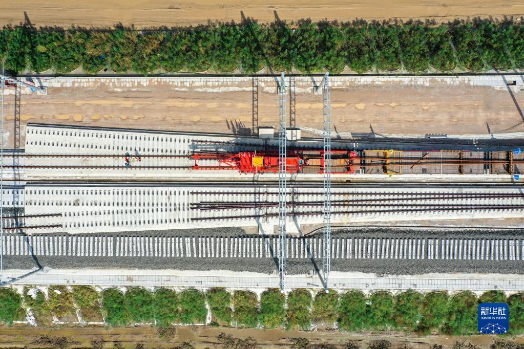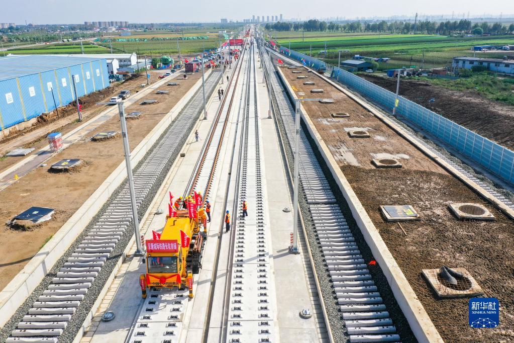 9月27日,铺轨机在京唐城际铁路铺轨现场作业(无人机照片)。新华社记者 牟宇 摄