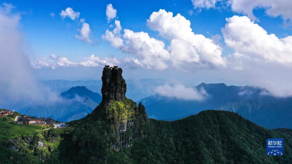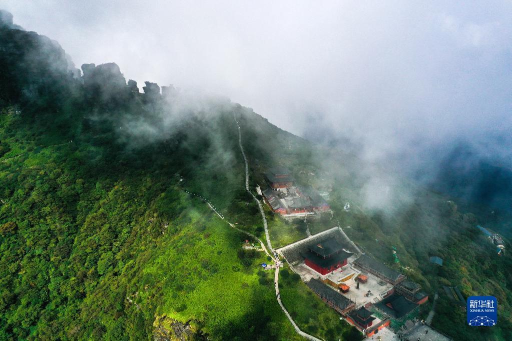 秋日,位于贵州省铜仁市的世界自然遗产地梵净山云雾缭绕、层峦叠翠。