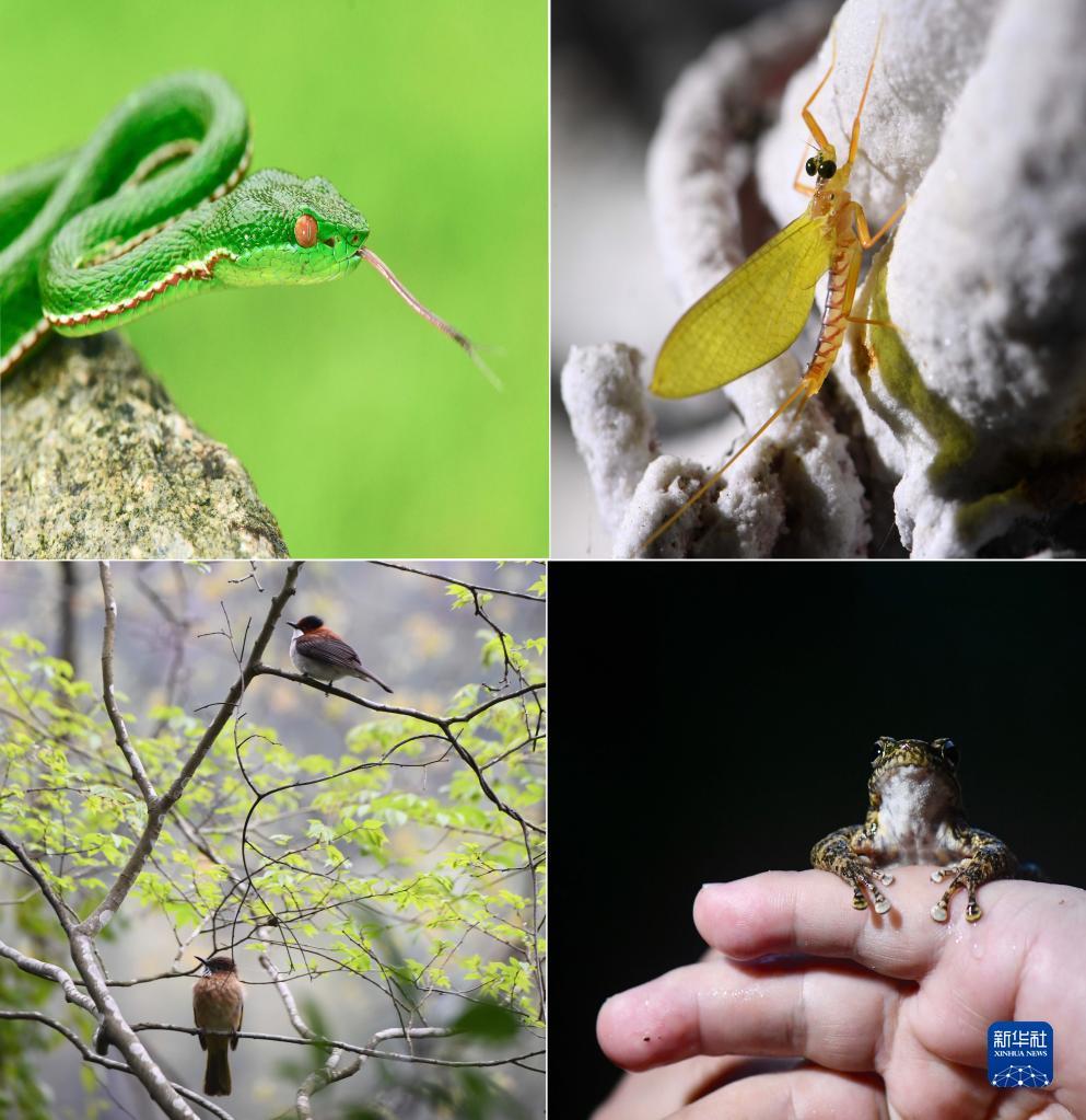拼版照片:左上图为在武夷山国家公园生物资源本底调查时发现的福建竹叶青蛇(2021年5月17日摄);右上图为武夷山国家公园桐木村拍摄的蜉蝣(2021年5月17日摄);左下图为在武夷山国家公园内拍摄的两只鸟儿(2021年3月21日摄);右下图为武夷山国家公园两栖爬行类专项科考队员展示在挂墩村附近山林发现的武夷湍蛙(2021年5月16日摄)。