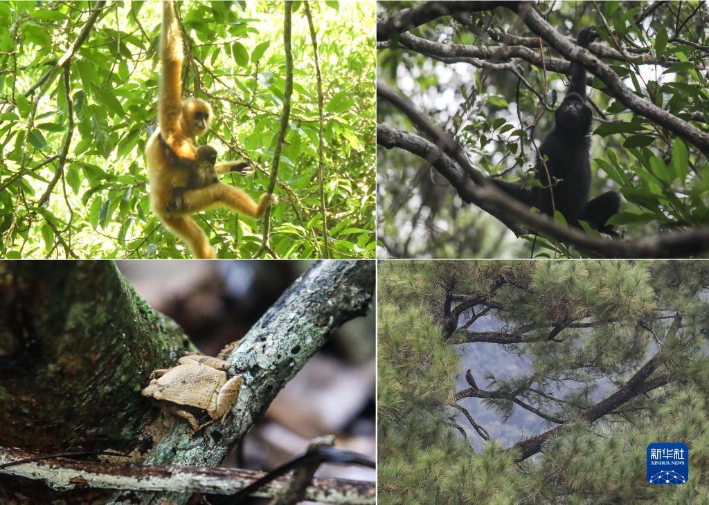 拼版照片:左上图为2021年5月拍摄的海南长臂猿B群幼猿(海南热带雨林国家公园管理局供图);右上图为在海南热带雨林国家公园体制试点区霸王岭自然保护区内拍摄的海南长臂猿(2019年10月25日新华社记者蒲晓旭摄);左下图为在霸王岭自然保护区内拍摄的姬蛙(2019年10月26日新华社记者蒲晓旭摄);右下图为在霸王岭自然保护区内拍摄的蛇雕(2019年10月26日新华社记者蒲晓旭摄)。