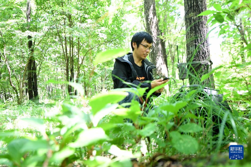 2020年7月21日,东北虎豹生物多样性国家野外科学观测研究站副主任冯利民在东北虎豹国家公园体制试点区的森林里检测智能红外相机。