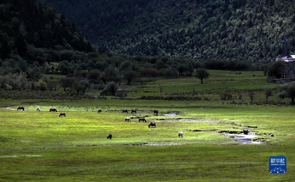 在普达措国家公园内,牲畜在洛茸村民小组附近的草甸上吃草(2019年9月16日摄)。