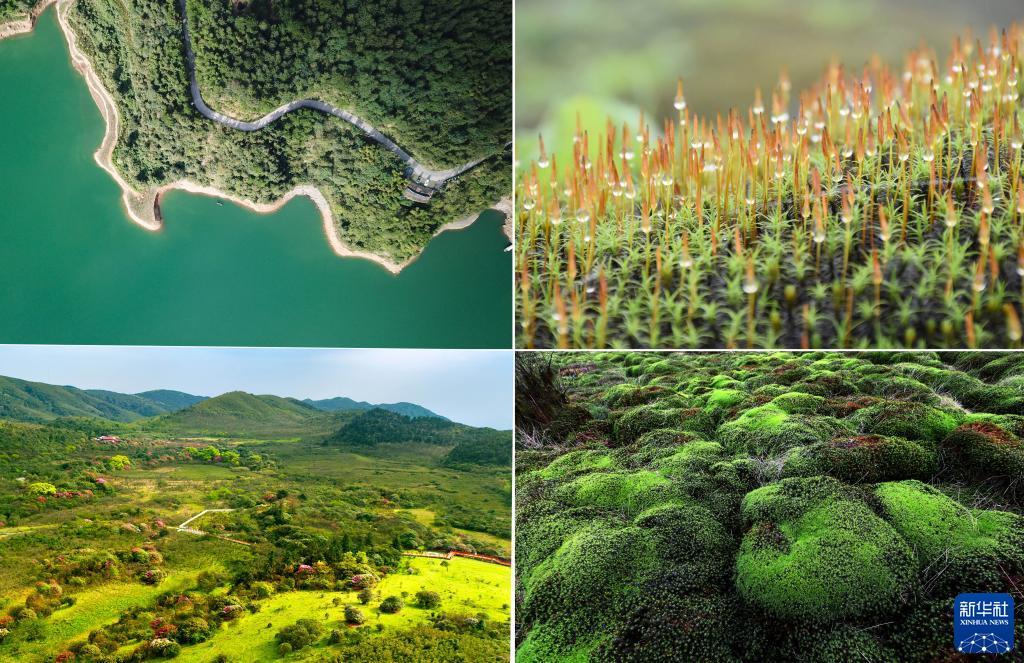 拼版照片:左上图为南山国家公园体制试点区的白云湖国家湿地公园一角(无人机照片,2021年9月23日新华社记者陈泽国摄);右上图、左下图为2018年7月9日拍摄的南山国家公园体制试点区的中山泥炭藓沼泽湿地(湖南南山国家公园管理局供图);右下图为2020年4月8日拍摄的中山泥炭藓沼泽湿地(湖南南山国家公园管理局供图)。