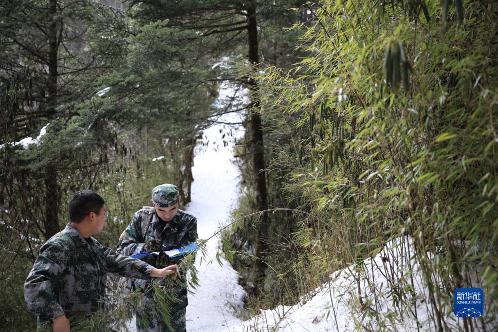 2019年12月13日,巡护员张雄(右)和许可在大熊猫国家公园甘肃白水江片区观察记录野生大熊猫主要食物之一缺苞箭竹的生长情况。