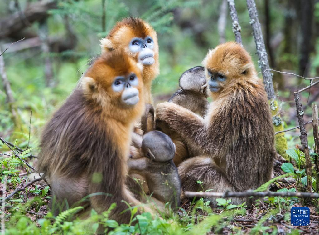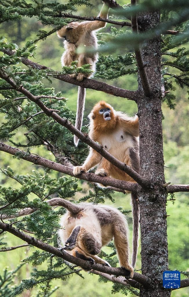 2021年5月19日,金丝猴在神农架国家公园大龙潭金丝猴野外研究基地山林中活动。
