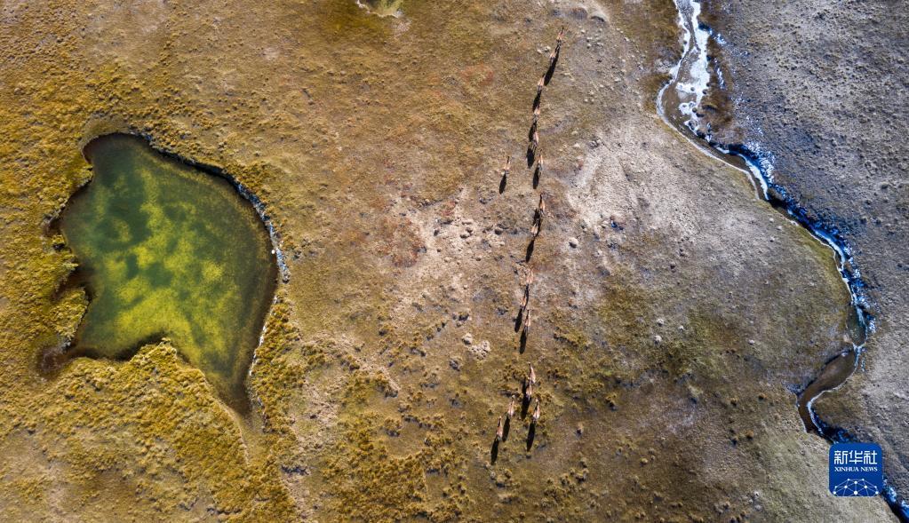 2019年10月19日,藏野驴在三江源地区活动(无人机照片)。