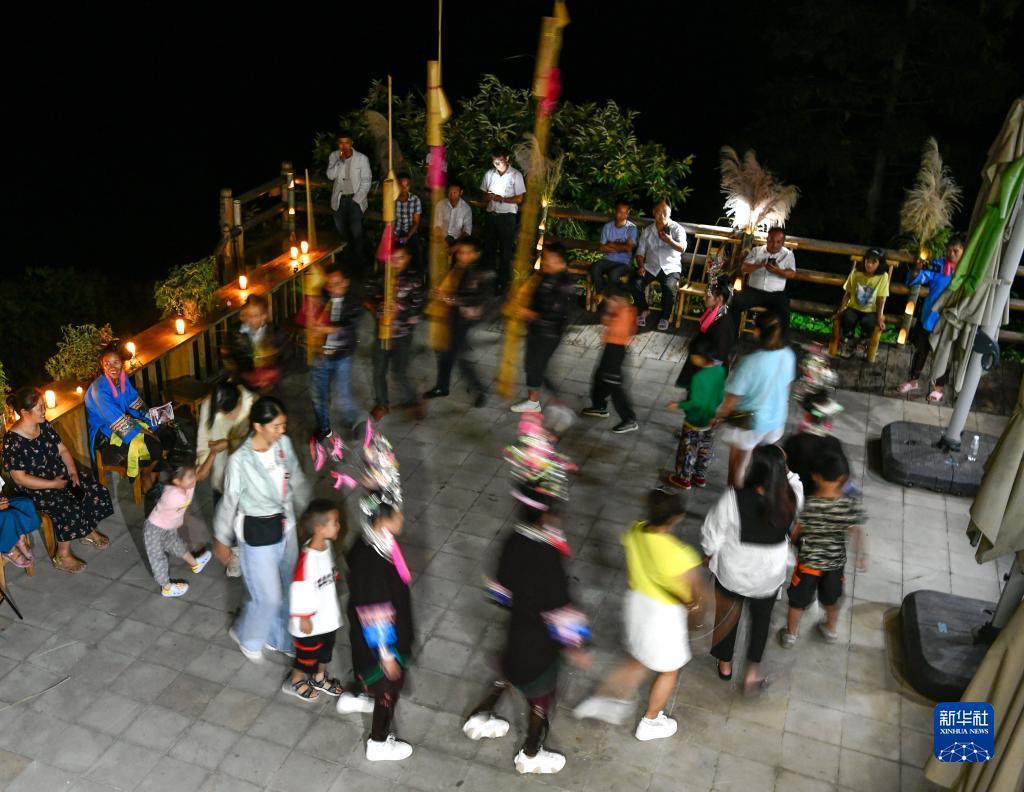 10月6日,在贵州省榕江县计划乡加宜村一家民宿,游客和村民在跳芦笙舞。