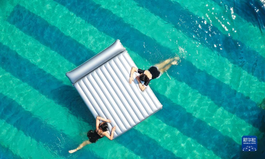 10月6日,游客在贵州省榕江县计划乡加宜村一家民宿游泳(无人机照片)。