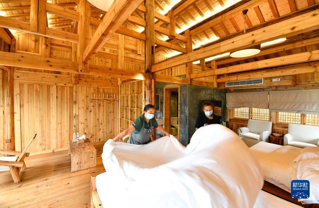 10月7日,在贵州省榕江县计划乡加宜村一家民宿,当地村民在整理客房。