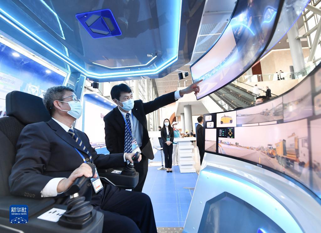 10月14日,在北京国家会议中心,参观者在工作人员的介绍下体验模拟操控道路施工设备的“智慧驾舱”。