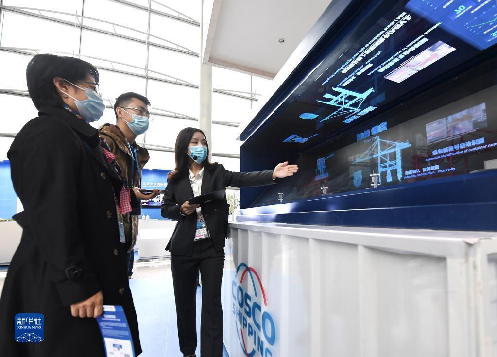 10月14日,在北京国家会议中心,工作人员向参观者介绍5G智慧港口动态演示。