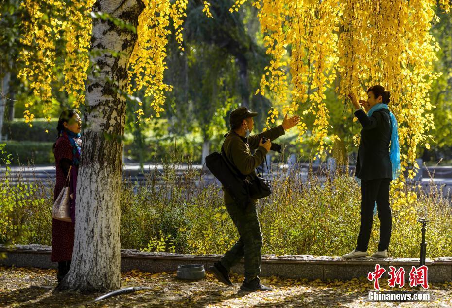 10月19日,新疆乌鲁木齐市人民公园,市民在黄叶下拍照留影。随着气温降低,公园内的树木逐渐泛黄,浓浓秋意甚是醉人。 中新社记者 刘新 摄