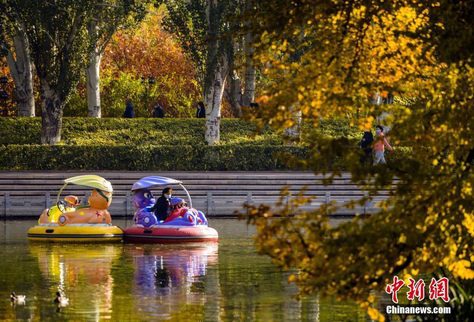 10月19日,新疆乌鲁木齐市人民公园,游客泛舟湖中。随着气温降低,公园内的树木逐渐泛黄,浓浓秋意甚是醉人。 中新社记者 刘新 摄