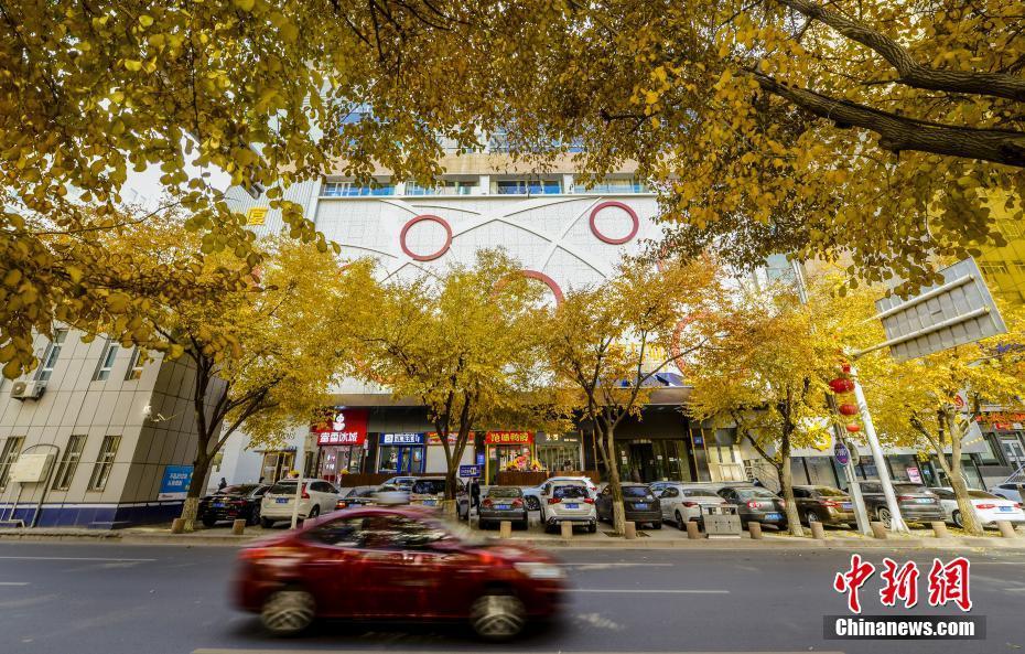 10月19日,新疆乌鲁木齐市,车辆行驶在街道上。随着气温降低,该市街道两旁的树木已是金黄一片,浓浓秋意甚是醉人。 中新社记者 刘新 摄