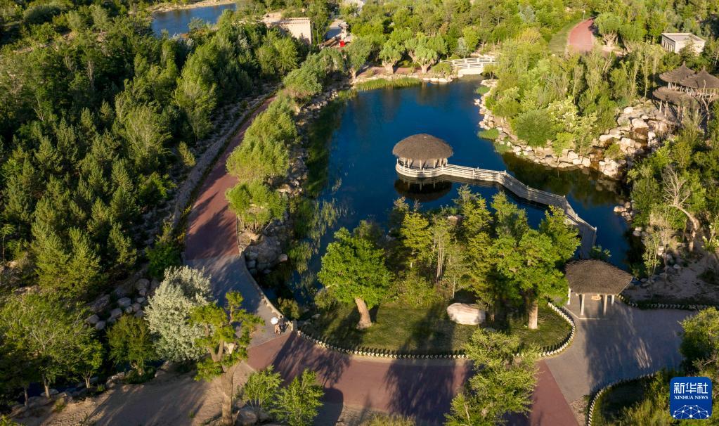 坐落在宁夏银川市贺兰山脚下的贺兰山运动休闲公园(5月27日摄,无人机照片)。这里曾是一片砂石采矿塌陷区。近年来,当地通过植被景观再造、水系建设、现代管网铺建等措施,重新利用废石、废坑及各类废弃建筑材料,把塌陷区建成了一座免费开放的主题公园。