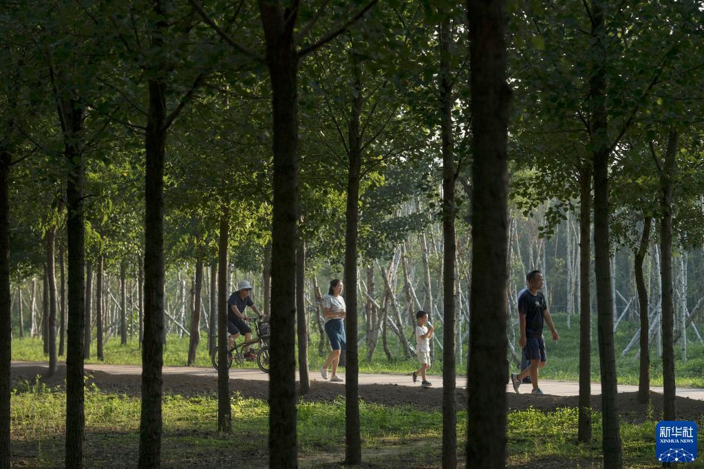 市民在陕西省合阳县城金水生态公园早锻炼(2018年7月19日摄)。2015年以来,地处黄河之畔的陕西省合阳县,坚持城乡建设与绿化美化同发展,建设防护林和绿色长廊,初步形成城乡一体化绿化格局。