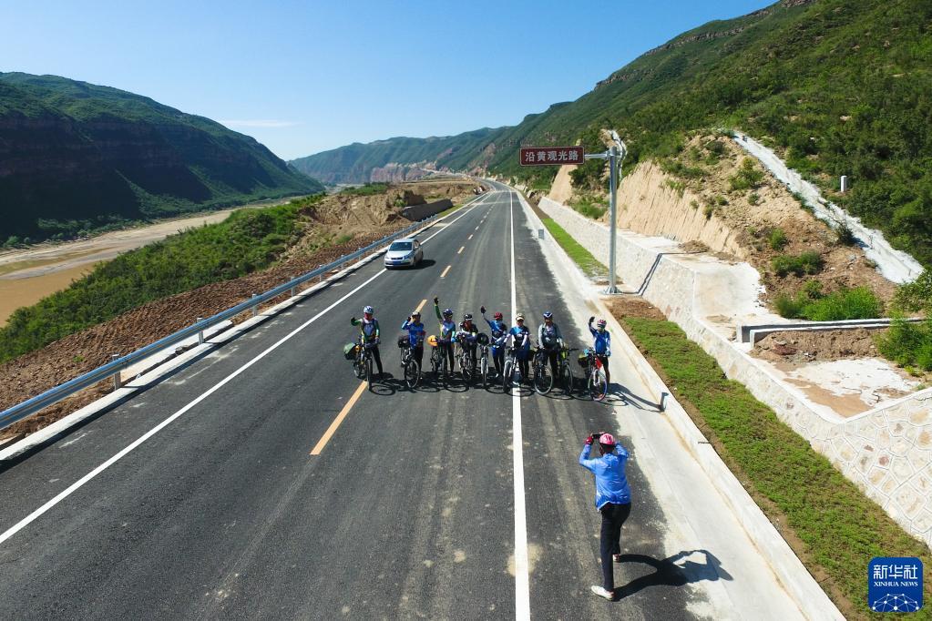 骑行爱好者在位于陕西省延安市宜川县境内的沿黄观光路延安段拍照(2017年8月9日摄)。陕西沿黄观光路是陕西省沿黄河西岸修建的一条南北向公路通道,北起榆林市府谷县,南至渭南市华山脚下,全长828.5公里,沿途穿越西岳华山、壶口瀑布、洽川湿地、黄河蛇曲国家地质公园等50余处景点景区,形成了一条丰富多彩、壮美秀丽的生态长廊,为当地黄河旅游带的形成和发展提供了良好的交通条件。