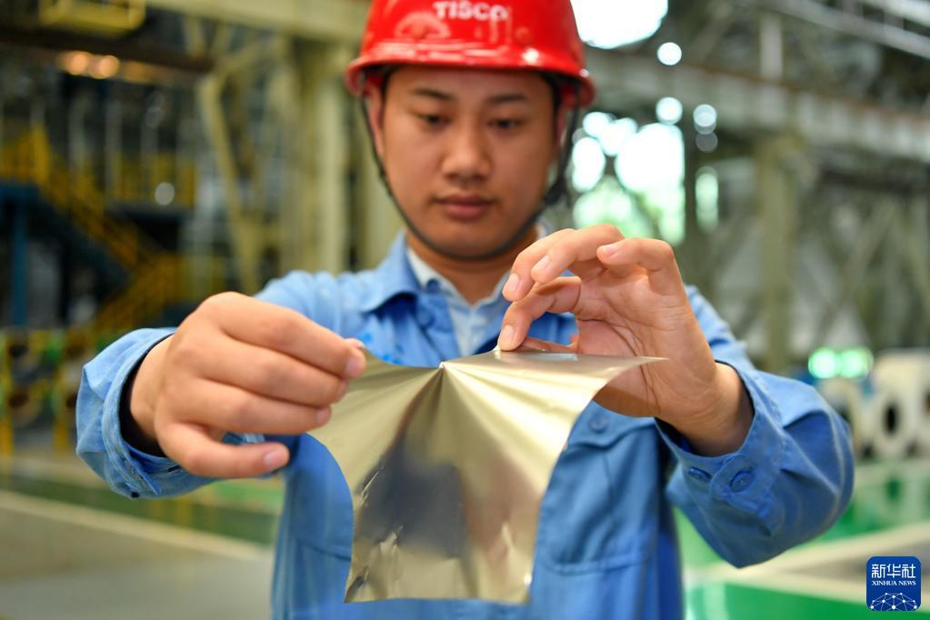 在位于山西的太钢集团,员工在展示用手撕开0.02毫米厚的超薄带状不锈钢(2019年5月24日摄)。作为不锈钢行业的领军企业,太钢集团潜心打造不可缺少、无可替代的高端精品,在毫厘之间下足“绣花功夫”。从“手撕钢”到“笔尖钢”,再到碳纤维,瞄准“高、精、尖、缺”,在最薄、最轻、最硬、最特殊的产品性能上展开竞争,把成为全球行业领军者、创新领跑者作为高质量发展的目标。