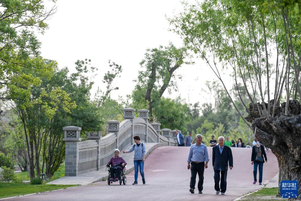 市民在宁夏银川市贺兰山运动休闲公园散步游览(5月29日摄)。这里曾是一片砂石采矿塌陷区。近年来,当地通过植被景观再造、水系建设、现代管网铺建等措施,重新利用废石、废坑及各类废弃建筑材料,把塌陷区建成了一座免费开放的主题公园。