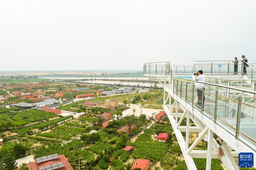 游客在玻璃栈道上欣赏黄河内蒙古托克托县段的黄河生态走廊建设工程美景(2020年7月16日摄,无人机照片)。